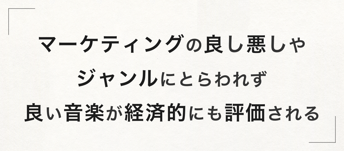 ぼくたちが目指す多様性のある音楽シーンとは、ジャンルやマーケティングの良し悪しにとらわれず、良い音楽が経済的にも評価されることです。