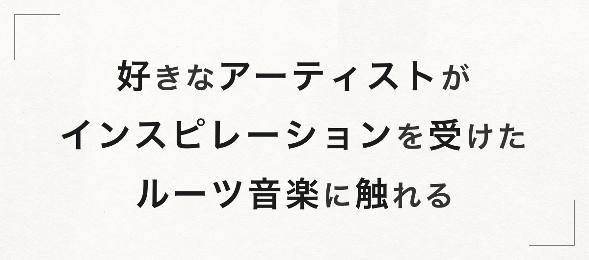 好きなアーティストの音楽性をより深く理解したり、ルーツ音楽からさらに繋がりを深掘っていくことで広がる新しい音楽との出会いを楽しむことができます。