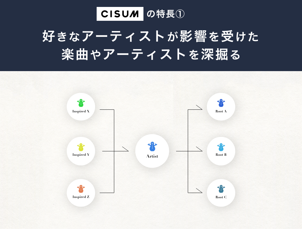 CISUMは、様々なアーティストのルーツ音楽を深堀りしたり、あなたが好きなアーティストが今注目している音楽をリアルタイムに知ることができる、リスナーの「好き」を広げるアーティスト深堀りアプリです。
