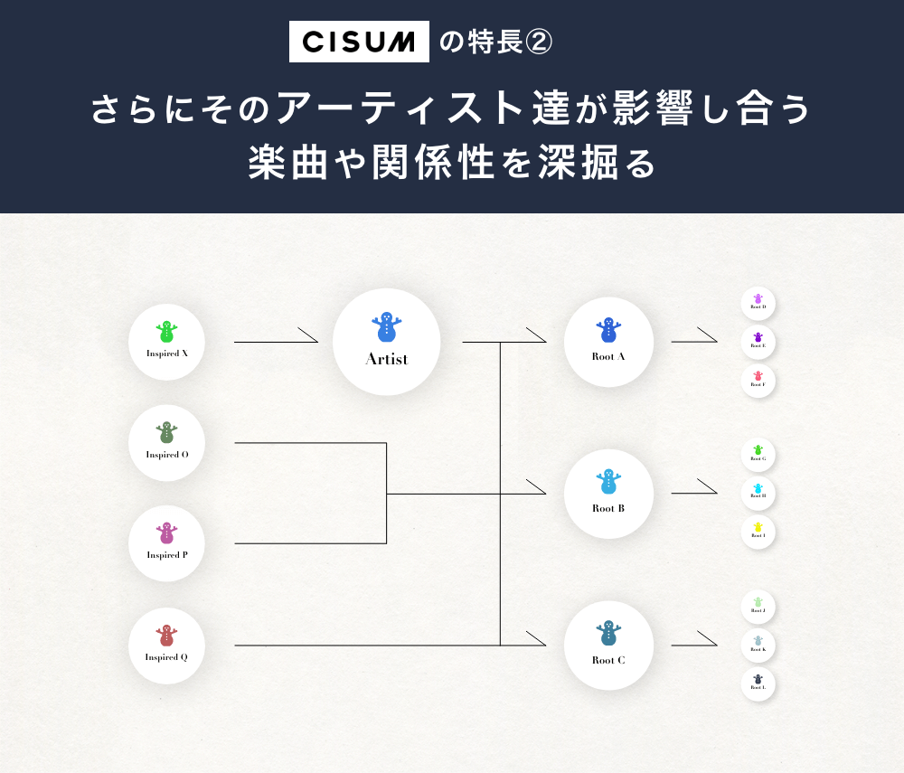 CISUMは1万以上のアーティストデータと10万以上の楽曲データをもとに、アーティスト・楽曲・関連人物などのつながりをデータツリー化し、スタイリッシュなデザインで誰でも簡単に人物や楽曲のつながりを辿ることができます。