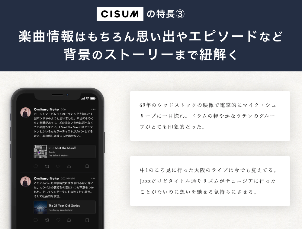 そんな体験をより身近で楽しいものにするため『CISUM(シーサム)』という新しい音楽のSNSアプリを開発しています。