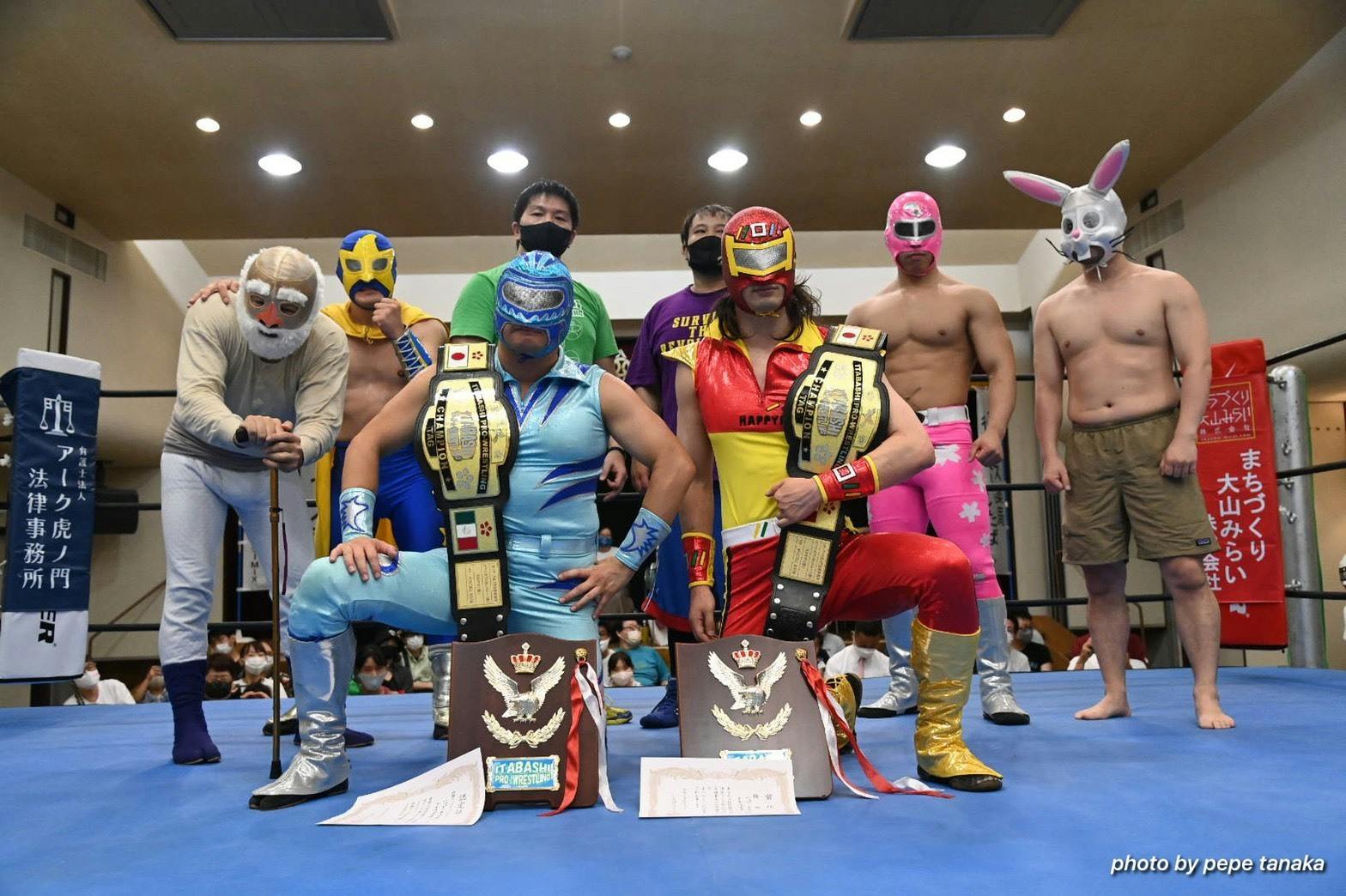 2021/07/24 19:03支援者の皆様、プロジェクトページをご覧の皆様こんにちは。この度プロジェクトで実現するお約束をしていた初代板橋タッグ王座決定リーグ戦を開催、そして初代チャンピオンチームが誕生したことをご報告いたします。5月GW5連戦で開催する予定だったタッグ王座決定リーグ戦が新型コロナウイルス感染拡大の影響で大会中止となってしまいましたが、6/13大会、7/22大会、7/23大会にてタッグリーグ戦を無事開催することができました。昨日7/23大会で最終戦を迎えたリーグ戦。多くの激戦の中、ハッピーロードマン&トキワダイオーが優勝し、初代板橋タッグチャンピオンチームが誕生しました。試合終了後、板橋区役所産業振興課長から賞状の読み上げ、チャンピオンベルトの授与が行われました。初代板橋タッグチャンピオンの誕生は未来への明るい一歩です。これからチャンピオンベルトを巡って生まれる数々のドラマをお届けできると思うとご支援いただいた皆様へ感謝の気持ちでいっぱいです。まだまだイベント収容人数は50%ではある世の中ですが、いたばしプロレスは皆様に元気と笑顔を届けてまいります。いたばしプロレスから皆様へ感謝の気持ちを込めて。本当にご支援ありがとうございました。今後ともどうぞよろしくお願いいたします。 いたばしプロレスリング株式会社 もっと見る全リターン商品発送完了のご報告
