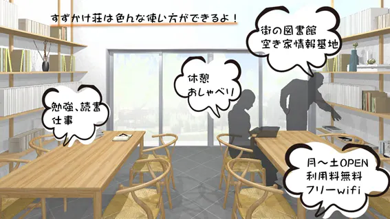 すずかけ荘は誰でも無料で、気軽に使えるフリースペースです。