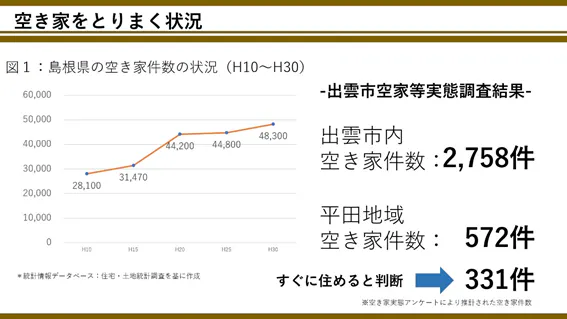 平田には現在572件もの空き家があります。そして、その半数以上がすぐに住めると判断できる状態=街の資源になり得る場所です。これらの空き家をこのまま放置すれば、老朽化が進み、人が寄りつかなくなり、危険を伴う、そんな集落や町並みになってしまいます。