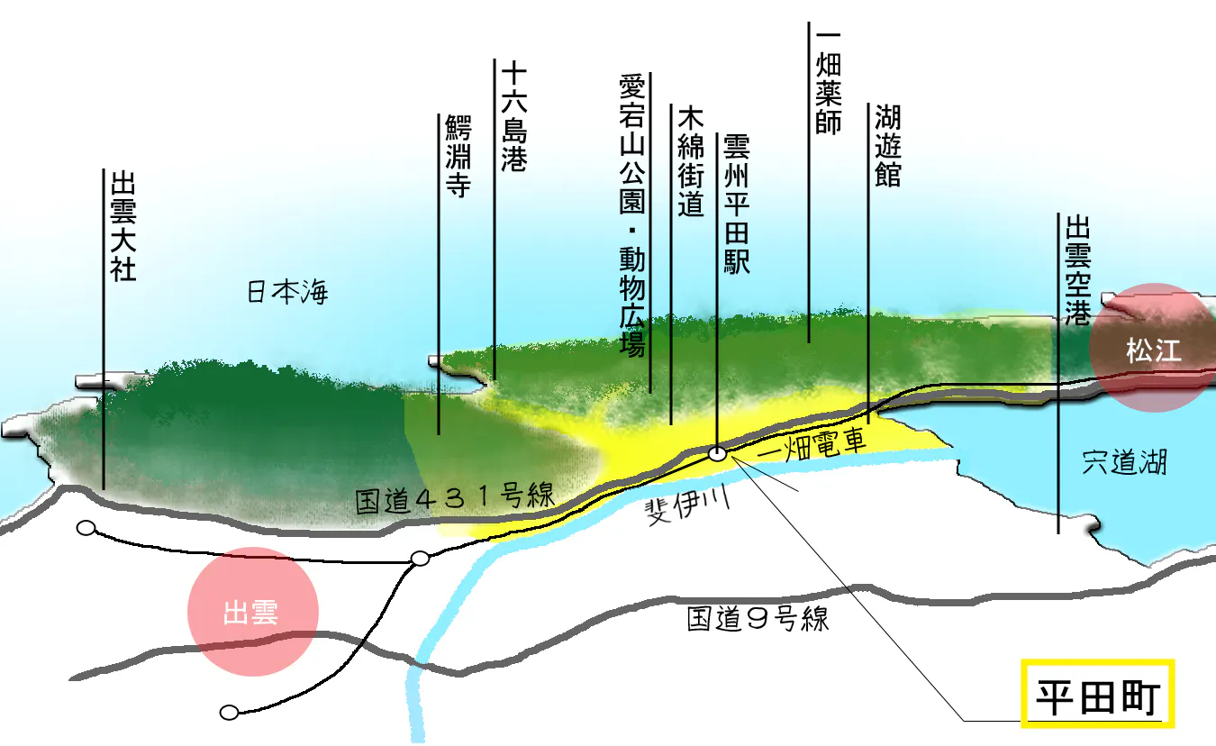 島根県の東部に位置する人口3万人弱の平田地域。東側は宍道湖、北側は山を挟んで日本海があり自然に固まれた地域でもあります。