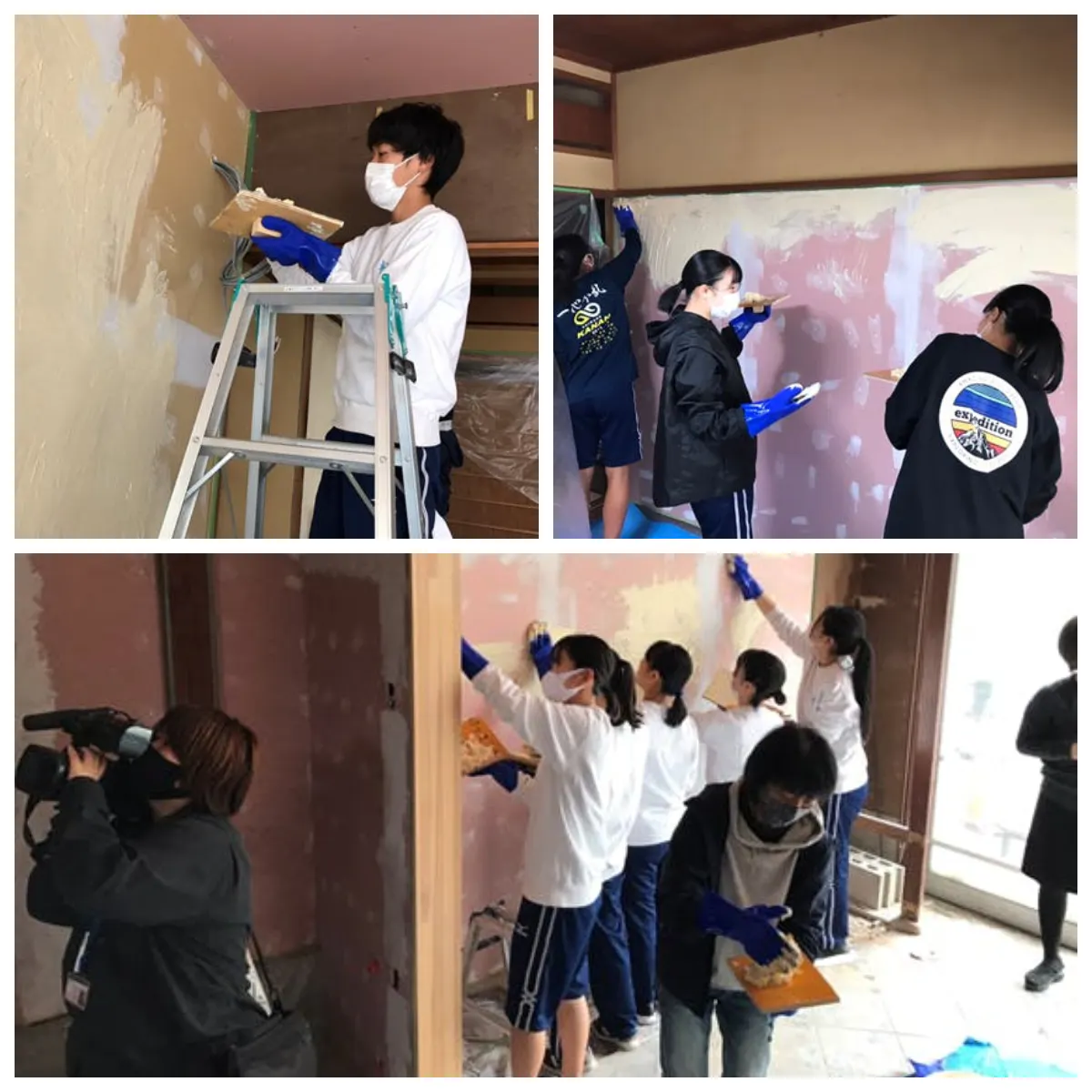 塗り壁は平田高校生と一緒に。手袋を使って、しっくいを塗るスタイルです。
