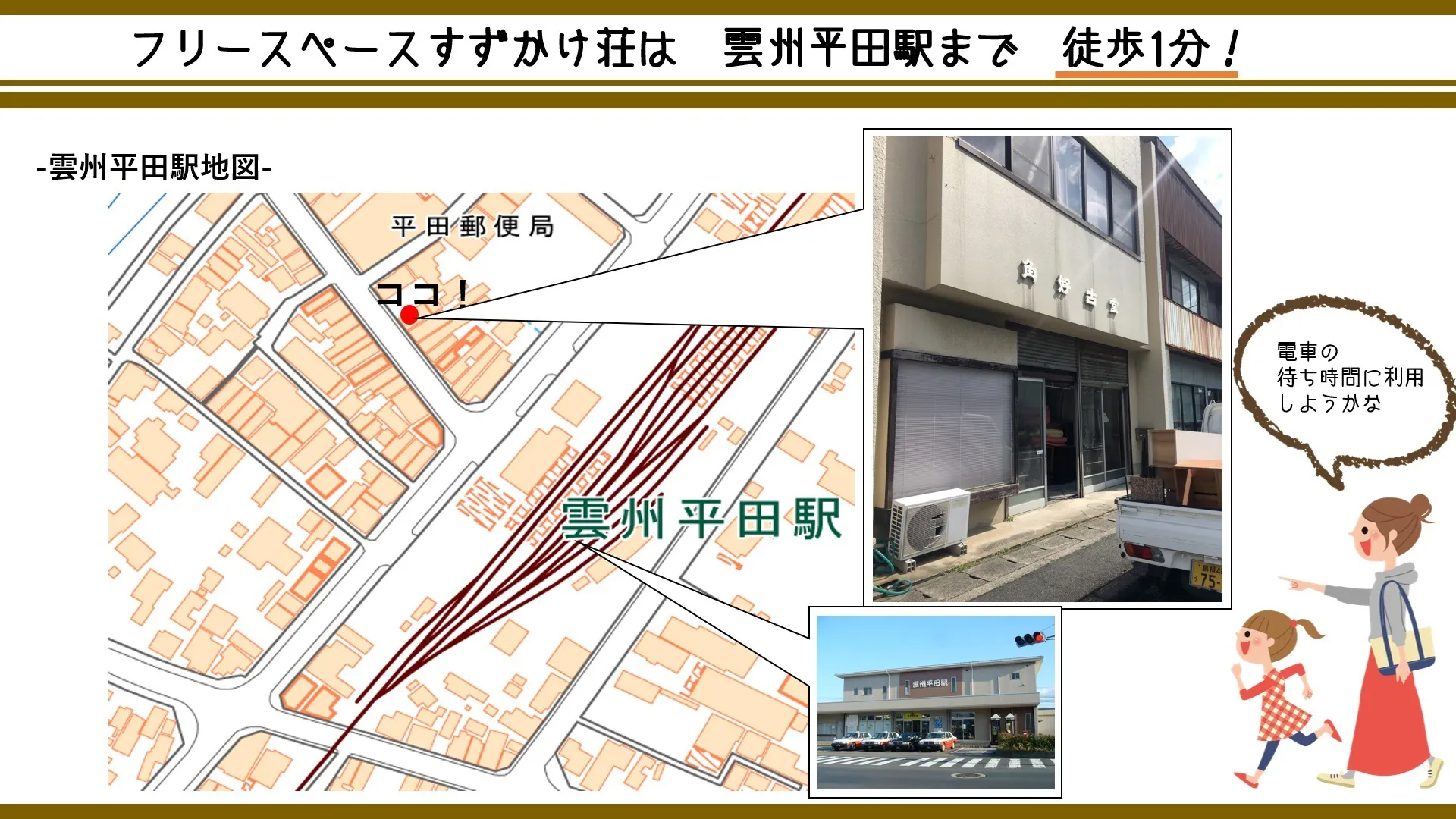出雲市駅へは車で15分、松江市へは車で30分、出雲空港へは車で15分とアクセスしやすく魅力的なスポットも数多くあります。