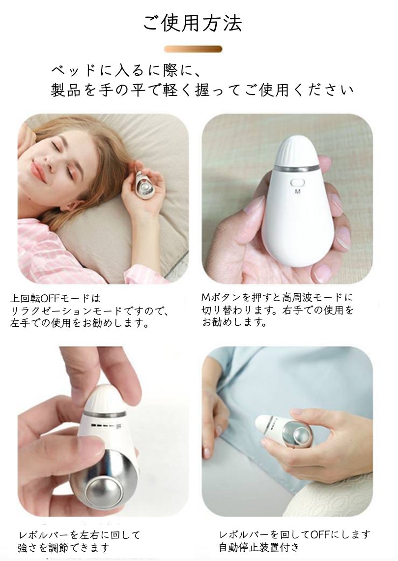 独自の微弱電流が、あなたを素早く眠りに導き、深く心地よい時間を提供します。充電式で、小型のため、どこにでも持ち運べます。多くの方が明日への不安感をいただいている現在だからこそ、一人でも多くの方に使っていただきたい・・・ということでモニター価格での提供を行います。