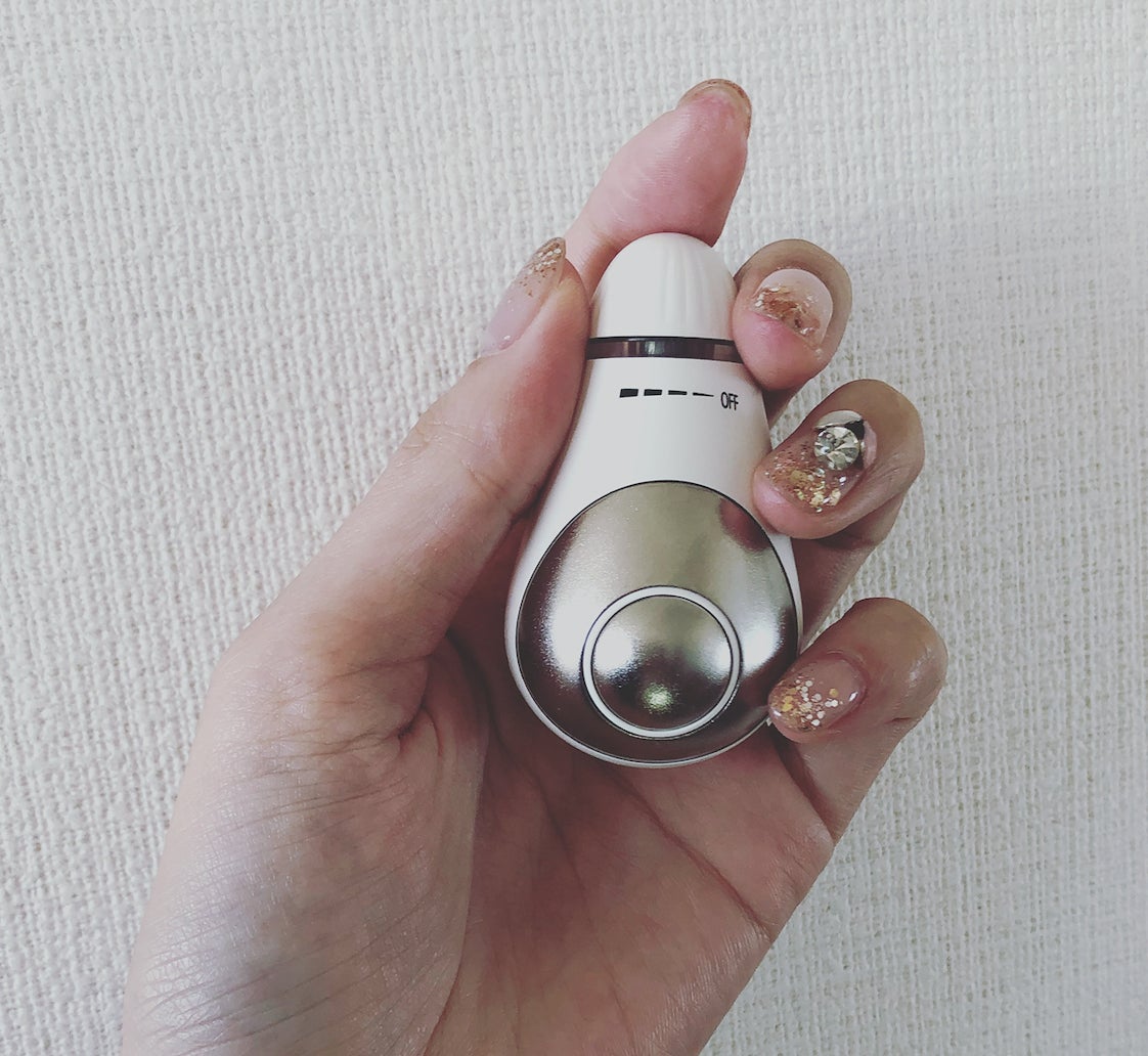 製品上部のレボルバーを回すだけ!微弱電流がスタートします。銀色の部分を左の手のひらに当たるようにして軽く握ってください。