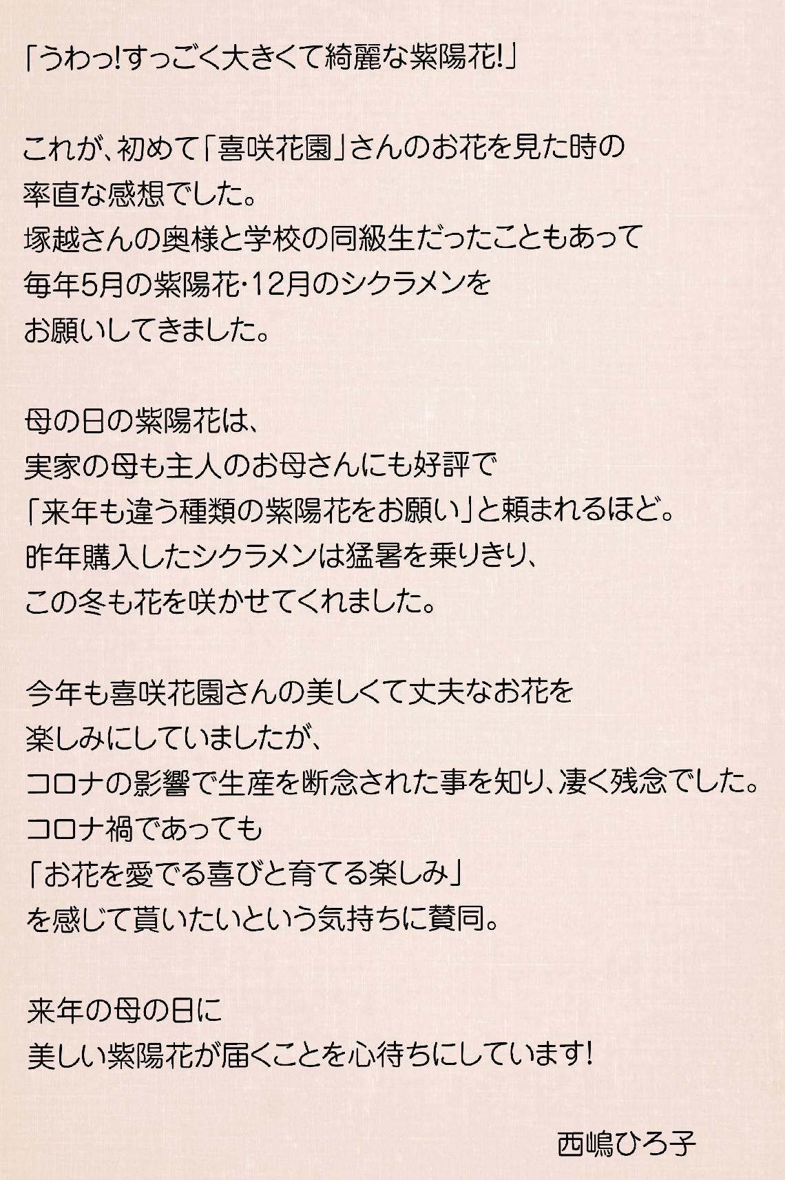2021/02/28 10:08こんにちは!喜咲花園の園主、塚越 誠です。毎度、毎度ご無沙汰しております。今回、クラウドファンディングを行い、考えられないほど沢山の方々にシェアされ、非常に沢山の方々に心配していただき、沢山の方々にご支援を賜り、本当に感謝しています。いよいよ本日が最終日となりました。目標金額には遥か届きませんが、皆様の気持ちが嬉しくて、沢山の方々から後押しをしていただき諦めていたシクラメンももう一度育ててみようかと思っているところでございます。園芸農家をはじめて約20年、下仁田町で独立し8年を迎えました。雪害やコロナの影響で沢山の方々にご心配をお掛けし、何度も気持ちが倒れそうになっても支えてくださり今があります。昨シーズンは思いを込めて育てた花をコロナの影響で届けることさえできませんでした。現在もなお生活環境は窮屈な状況が続いており、なかなか外出できる状況ではありませんね。しかし、私どもは今年の母の日を、去年のような寂しい母の日にはしたくないと思っています。贈った人も贈られた人も 心を癒して笑顔にしてくれる花を全国の人に知ってもらい、届けたい。処分なんかしたくない。と言う気持ちからクラウドファンディングのプロジェクトを開始しました。喜咲花園だけが特別被害にあってる訳ではありません。影響出ている事業は測り知れず、花の同業者や関連会社も皆影響し、市場でさえ廃業しているところもあります。なので、プロジェクトがシェアされたことで、今年の母の日には、また花を贈ろうかな!とか、今までは花じゃなかったけど、今年は花を贈ろう!とか、あわよくば、今年は喜咲花園のあじさいを贈ろう!思って戴けるだけでも嬉しいのです。伝統製法は有りませんが、愛情管理は365日欠かすことなく行っています。贈っても贈られても、飾って恥ずかしくない状態の良い花にラベルを付けて出荷しています。全国配送も承っています。どうか、今年の母の日は大切な人に是非、気に入った花を贈って頂けたらと思います。このプロジェクトを助言、協力してくださった方々から繋いで頂いた、人の繋がりから素敵なコラボも実現しそうで感謝しております。また、プロジェクトが終了後も発信していきたいと思います。今後も引き続き喜咲花園をご支援賜りたく存じます。 感謝感謝です。 塚越 誠 もっと見る