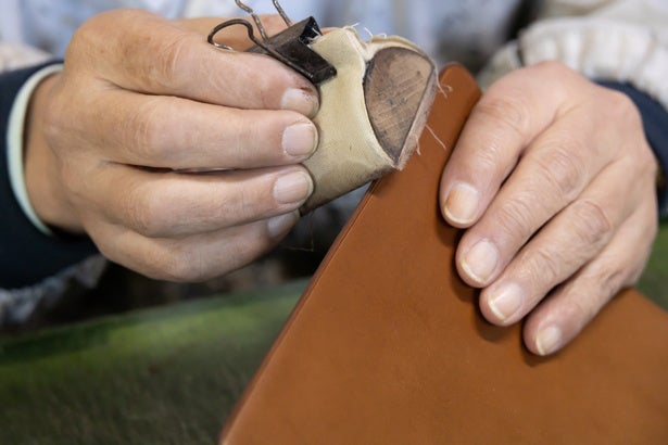 全パーツの革のコバ面は、すべて角を落としてから表面をなめらかに仕上げていきます。その後コバ用塗料を塗っては乾かして二度塗りし、最後に保護用のトップコートを塗布し、完全に乾いてから表面を手作業でバフ仕上げします。乾かしながらのこの作業だけでパーツごとに丸1日づつ掛かります。