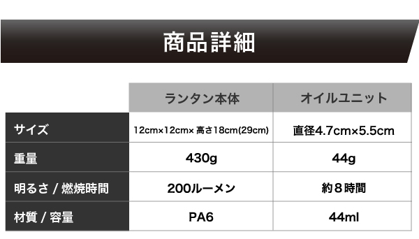 A.オイルユニットの小さな炎の熱から約200ルーメンの明るさを作り出します。