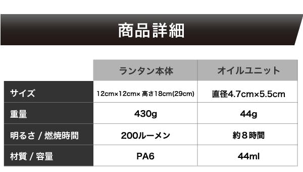 オイルユニットひとつ、たった44mlの燃料で約8時間の燃焼・点灯が可能!