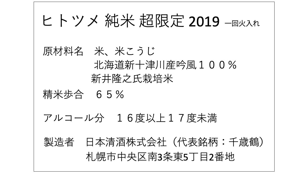 「ヒトツメ 純米 超限定 2019」は北海道新十津川産の酒造好適米「吟風(ぎんぷう)」を100%使って醸造しています。