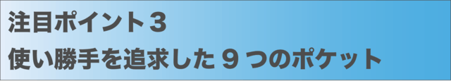 前後合わせて9つのポケットを配し、手ぶらでの快適な移動を実現します。また、海外旅行などセキュリティが不安な場面でも、カードポケットにはRFIDブロック機能があるため、旅先での1本としても優れています。