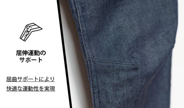 また、膝部分に施されたステッチが屈伸運動をより負荷なく行うことを実現します。