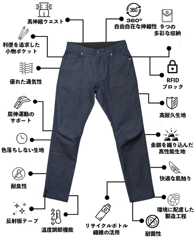 16の機能とスタイリッシュなデザインを両立したこのデニムは、独自開発生地と、その先端技術により、それこそ365日24時間履き続けることが可能な一本となっています。