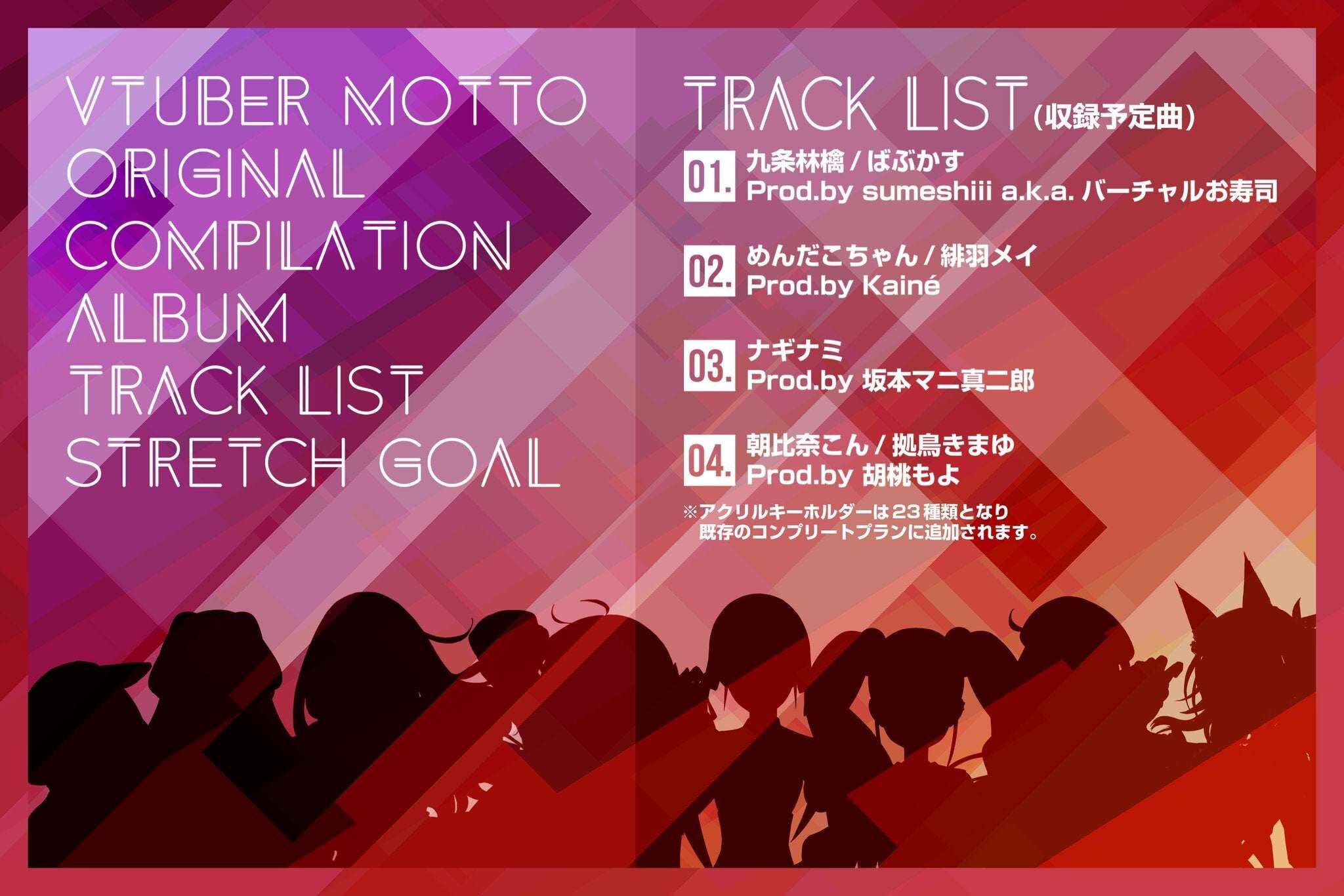 素敵なVTuberを一人でも多くの方に知っていただきたい。そのきっかけになるようにとこのプロジェクトを立ち上げました。VTuberの音楽が好きな方はもちろん、普段VTuberを見ない方への入り口になるような楽しいアルバムを目指しており、VTuberの世界を広げていければと考えております。