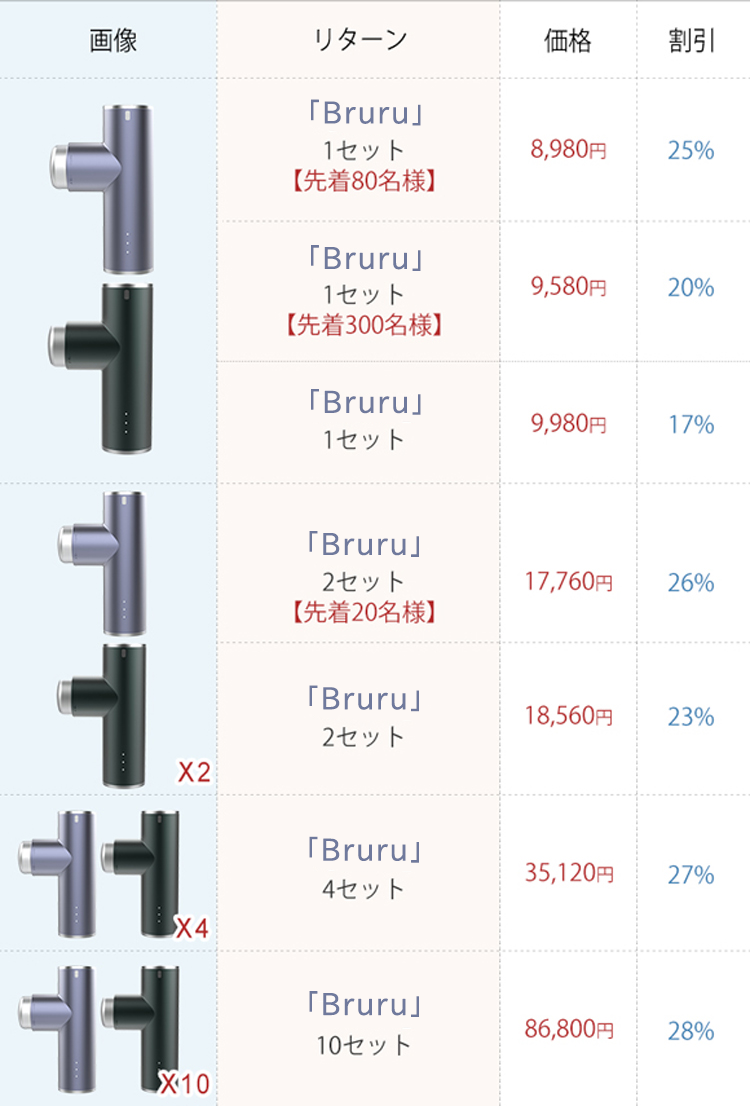 時間が無くて忙しい毎日を送られているあなたには、「Bruru」の二刀流!半分の時間で左右をまんべんなく均等に刺激。あっという間にリセット完了です。とってもお得な2セットのリターンを選んでぜひお試し下さい。