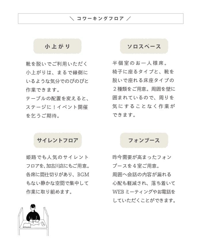 加古川店のみでご利用いただけるコワーキングスペース利用券と食堂利用券を2種類ずつご用意しました。