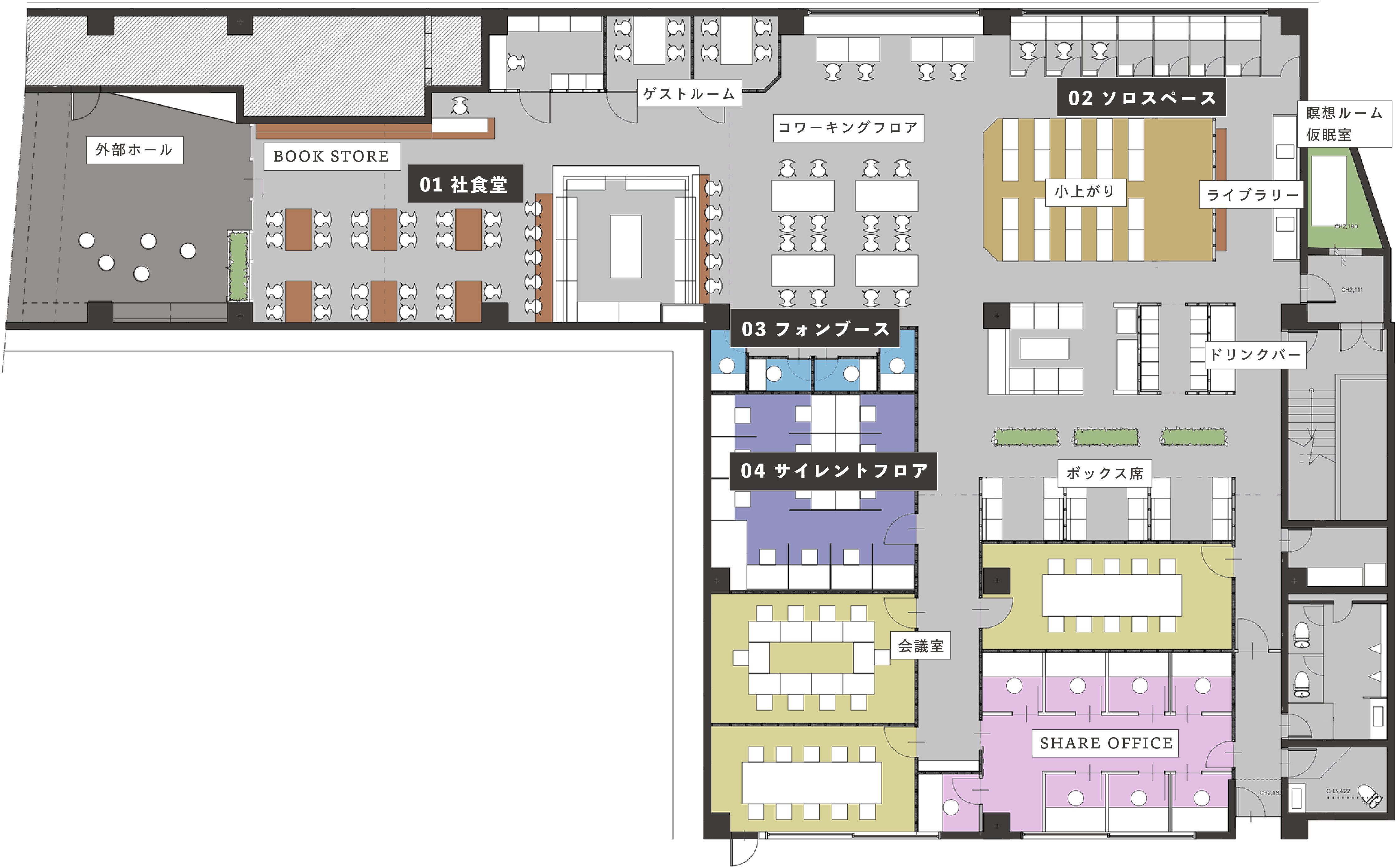 エントランス付近にはブックストアや食堂などを配置し、一般のお客様も立ち寄りやすい空間になっています。 奥に進むにつれてプライベート性が高くなる広い店内には、いろいろなタイプの座席をご用意します。