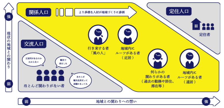 「関係人口」とは、移住した「定住人口」でもなく、観光に来た「交流人口」でもない、地域と多様に関わる人々を指す言葉です。