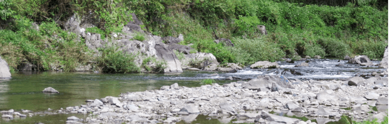 この場所の周りは、圧倒的されるほどの樹木に囲まれ、流れる川のせせらぎが聞こえる場所です。