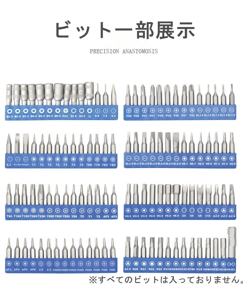 ◆ スリムタイプ、ラージタイプのドライバーハンドル2種類と、プラス、マイナス、六角、星型とあらゆる形状及びサイズのビット156種類をセットに。電子デバイスからDIY、家具の組み立てまであらゆる作業に対応。