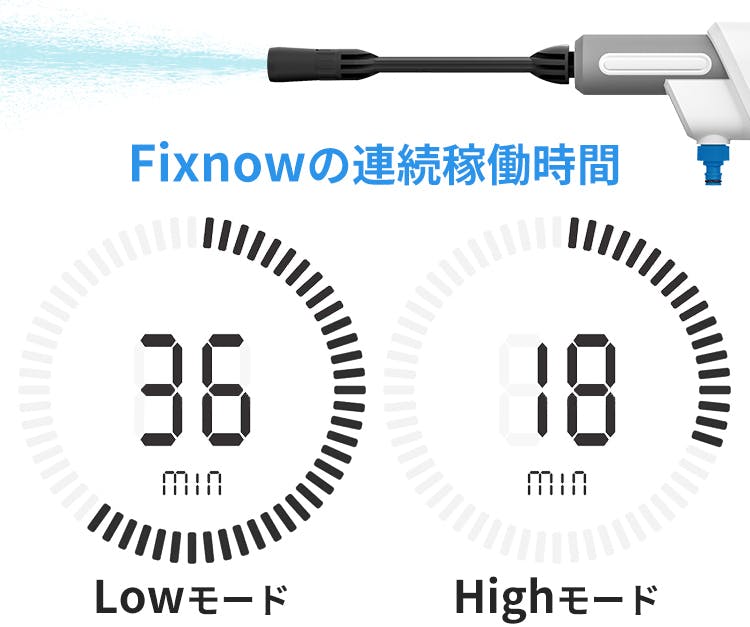 「Fixnow」なら、フル充電の場合、Lowモードで約36分間、Highモードで約18分間連続稼働します。これはあくまでも水の吐出時間。