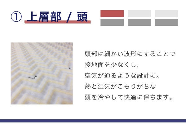 →この5つの組み合わせが、正しい S 字カーブをキープでき、腰をしっかりサポートするマットレスを作り出します。
