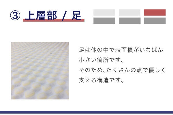 ●下層はウレタンフォーム(スーパーハードタイプ)で作られており、上層を点で支え、背中とおしりの沈み込みを防ぎ最適の状態に保ちます。