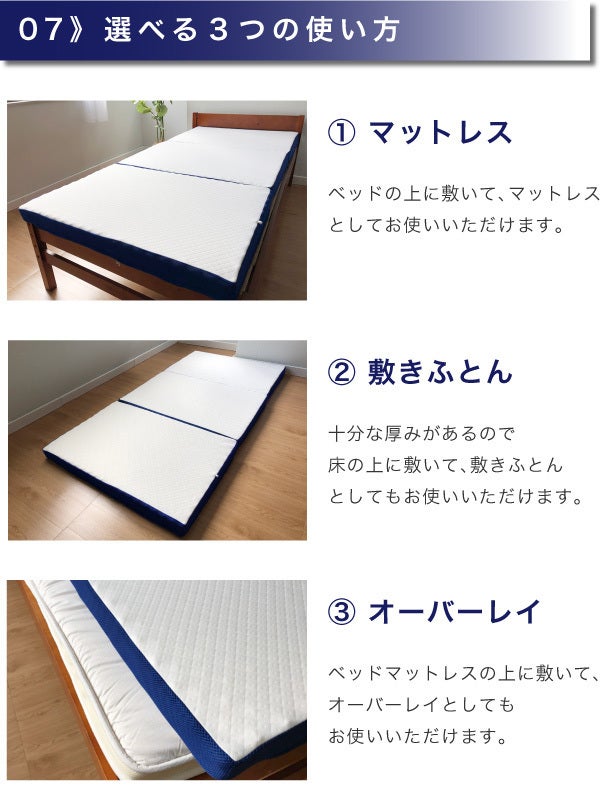 A:床、ベッドフレーム、マットレスと3パターンの使い方がありますが、柔らかいベットマットレスの上に敷くと本品が沈み込んでしまうことがあるので、フローリングや畳、またはベッドフレームの上に直接敷いてお使いすることをお勧めします。側生地の汚れや傷みを防ぐためにシーツやカバーをお使いください。
