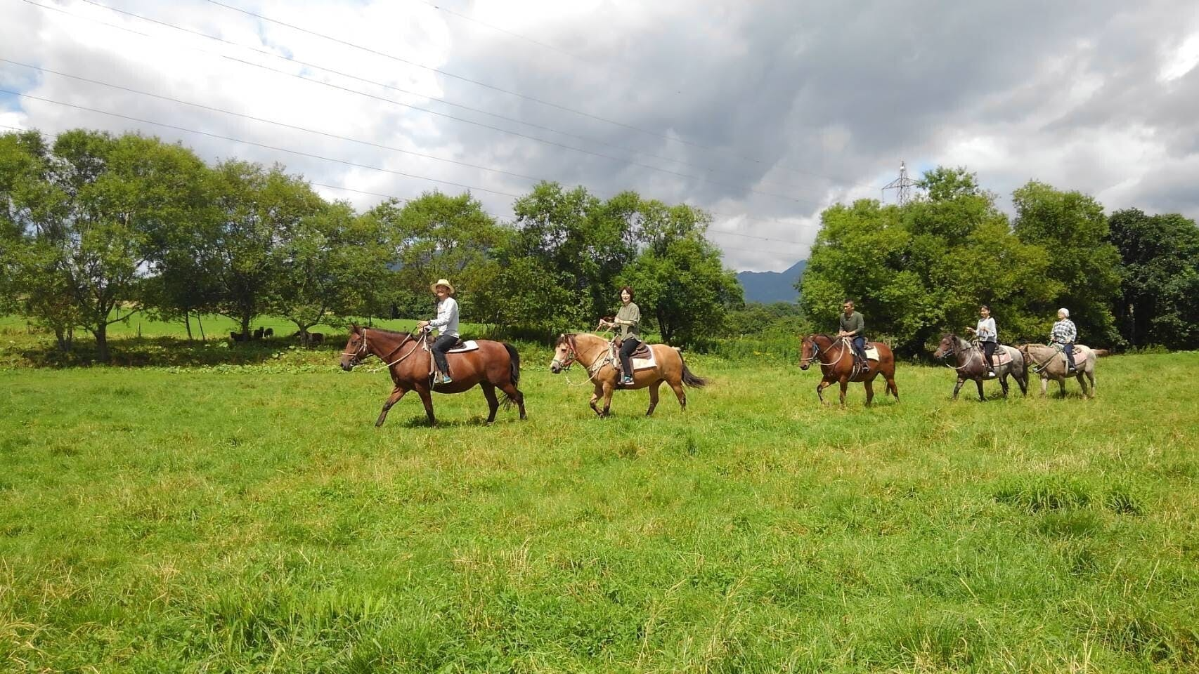 おすすめのプランは32,000坪の広大なフィールドで行う外乗です。少し馬場で体を慣らしたら東京ドーム2個分の大自然にみなさんをお連れします。遮るものがなにもない広く青い空、丘の上には見渡す限りの草原、馬上から望む太平洋、そこに沈む夕日、言葉では語り尽くせないほどの美しい場所がみなさんを待っています。