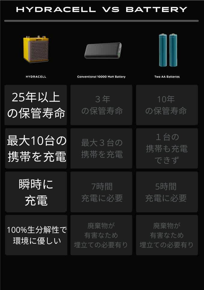 HydraCellと、従来の充電型パワーバンク、電池を比較してみましょう。