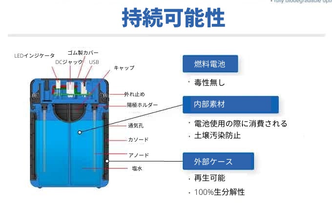 A. HydraCellに7.5%の塩水を投入してください。そうするとセルが活動し、何らかの電子機器を繋げていただくと(例えばスマートフォンをUSBポートから繋げる)マグネシウムと酸素の間に化学反応が始まり、イオン交換により電子(力)が放たれます。放たれた電子は炭素正極集電体により集められ、パワー(電気)へと変換されます。