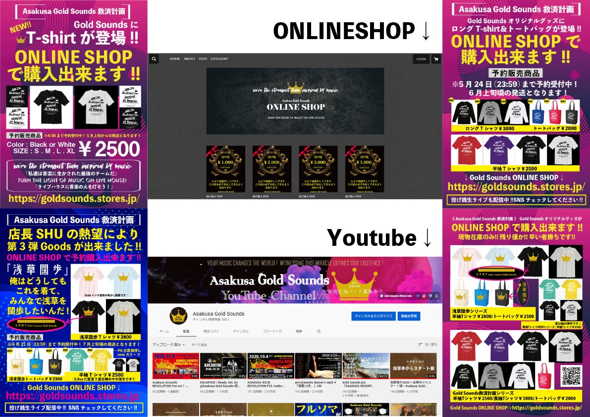 その中でもGoldSoundsは、ONLINE SHOPでの支援グッズ販売、ライブハウス支援プロジェクトへの参加、アーティストに協力してもらって投げ銭を募る無料配信ライブ、ライブハウスの内情を伝えようとYouTubeからの発信をし続け、10月には花劇場で行う予定だったフェスに出演予定だったバンド7組と無料配信イベントの開催を実現し、歴史の浅い中でも多くの方のご協力と気持ちを頂きながらスタッフ・業界関係者・出演者・お客様全員の夢とライブハウスの灯を消さないようにとギリギリのところで営業を続けて参りました。