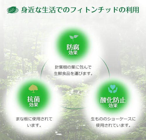 代表的な効果としては、①消臭 ②除菌・抗菌 ③リラックス ④抗酸化効果 などが知られています。昔の人は植物の不思議な力(フィトンチッド)に実体験から気付き、ヒノキ風呂、まな板、升酒、かしわもち等・・・日常生活のさまざまな場面で、フィトンチッドの効能と香りを利用してきました。