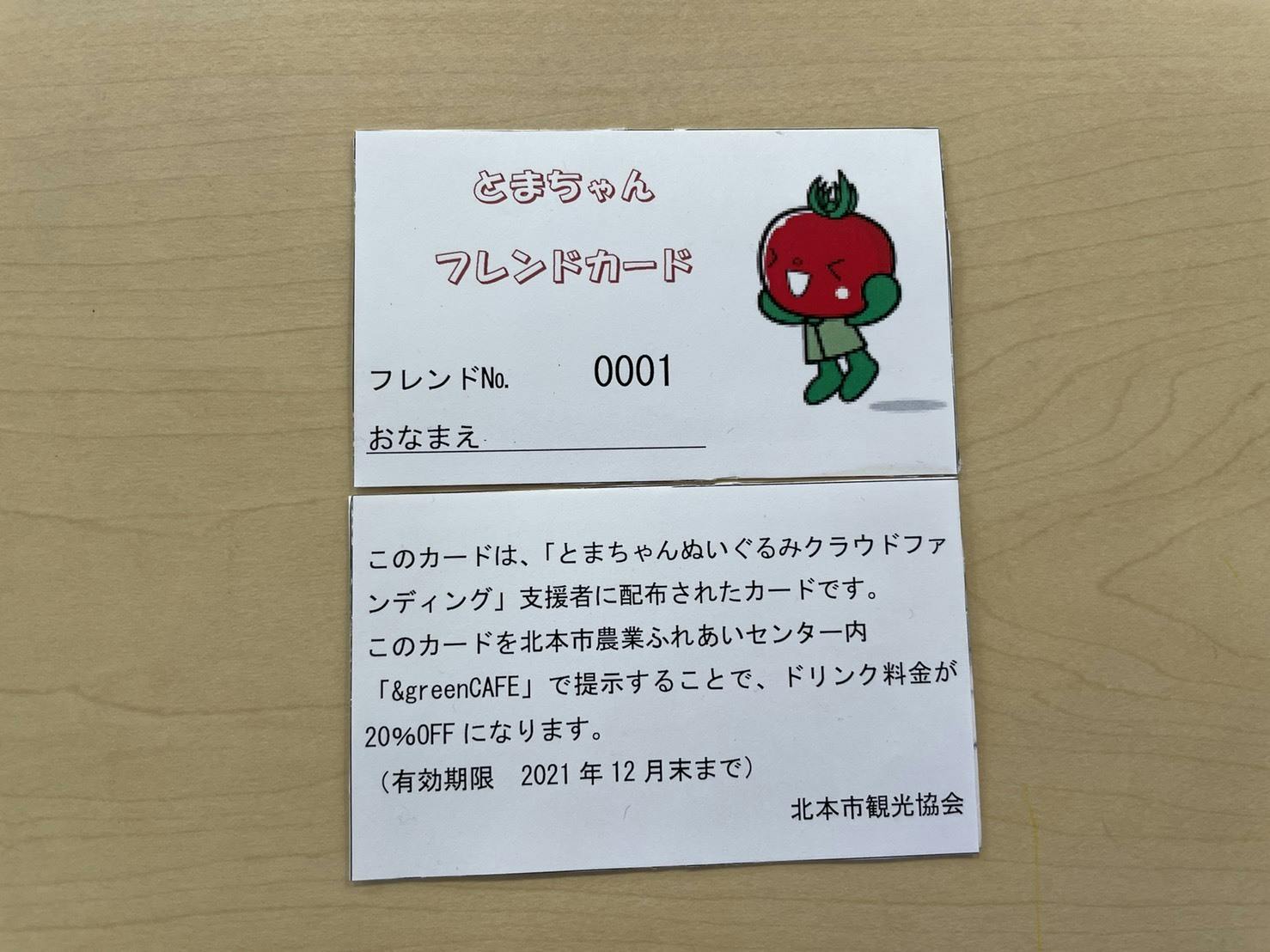 クラウドファンディング支援者限定のフレンドカードです。このカードを北本市農業ふれあいセンター内「&greenCAFE」で提示することで、ドリンク料金が20%OFFとなる割引サービスが受けられます。(有効期限 2021年12月末まで)