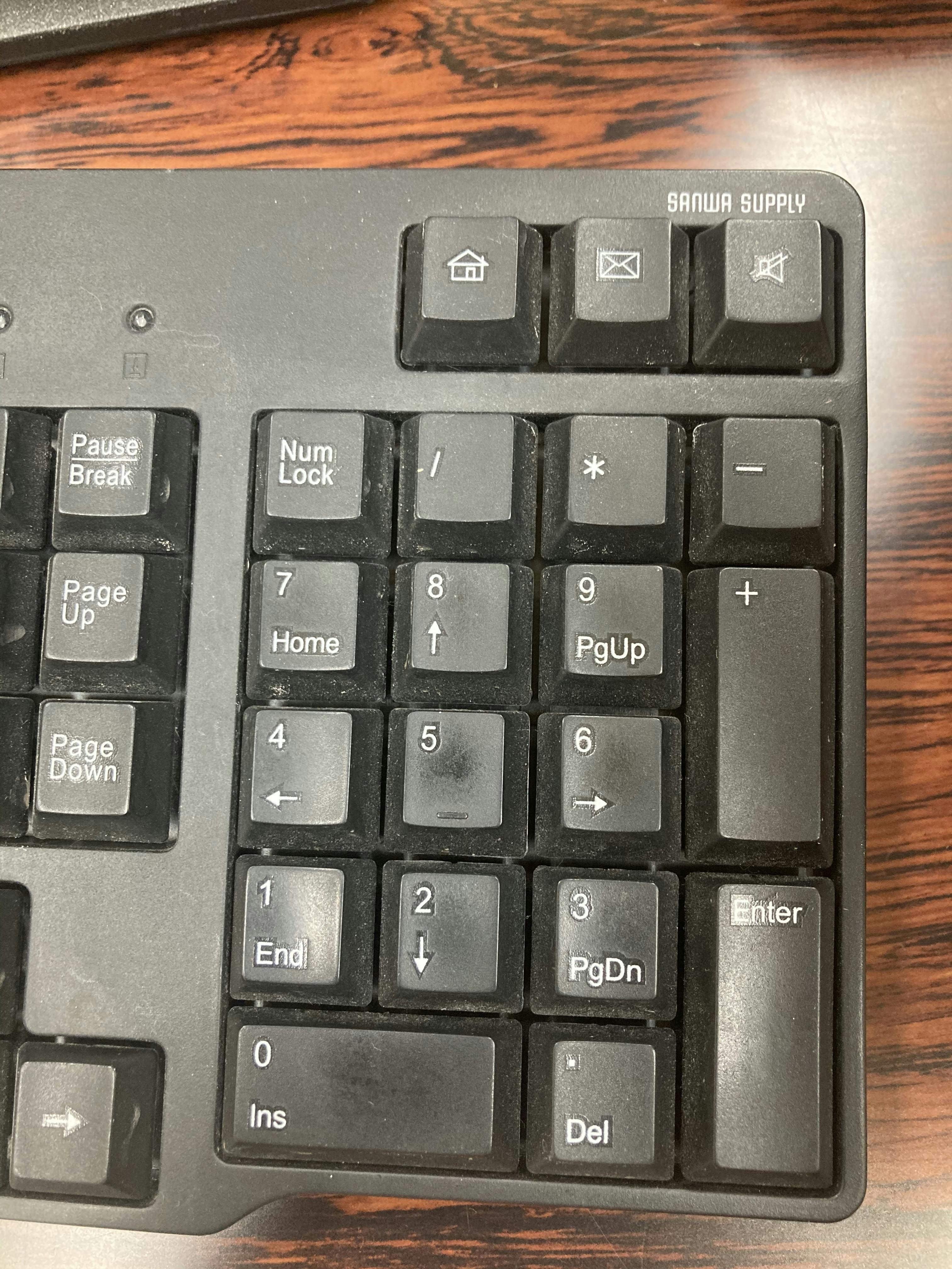 2021/02/20 09:00昨日のキーボードの続きで、これがキーボードに備え付きのテンキーです。見てわかる通り、7を押す際にnumlockキーを押してしまうことがあり、そうなるとテンキーが反応しなくなります。弘法筆を選ばずと言いますが、当施設では選びまくっています。先日上げたドライバも一本千円以上するドイツ製のものを使っています。ミスしないように教えるよりも、ミスが起こり得ない環境もしくは少しでもミスが減らせて楽できる環境作りを心がけています。 もっと見る