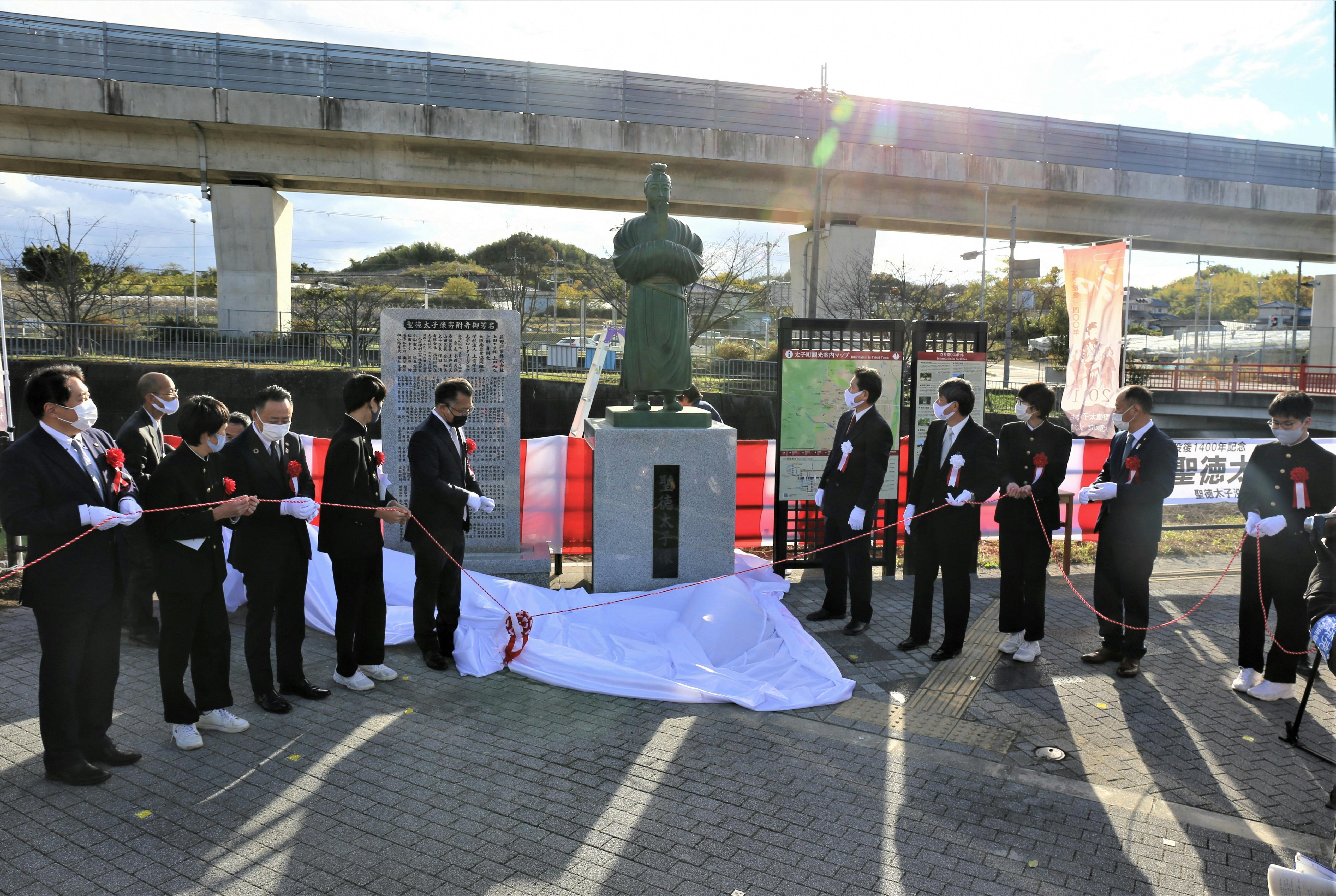 2022/01/19 11:00多くのみなさまよりご支援・ご協力をいただき、作製を進めていました聖徳太子像がついに完成し、令和3年(2021年)11月27日(土)、近鉄上ノ太子駅前にて聖徳太子像の除幕式が行われました。新型コロナウイルス感染症の影響のため、主催者・関係者のみでの開催となりましたが、幕が降ろされると全長3.2mとなる聖徳太子像が現れ、感嘆の声と拍手が起こりました。台座の左面には実行委員会の言葉として作製に至った経緯が、右面には町を代表して、田中町長と町立中学校生徒の寄稿文が刻まれています。無事に完成の日を迎えることができ、喜びと安堵の気持ちでいっぱいです。これからはこの地を訪れる人を迎えるとともに、次の100年に向けて地域を見守ってくれるシンボルとなることを願っています。聖徳太子没後1400年の節目の年に聖徳太子像の建立という一大事業を成し遂げられたのも、支援者のみなさま、地域のみなさまのお力添えがあってこそのものです。改めてお礼申し上げます。誠にありがとうございました。お近くにお越しの際は、ぜひお立ち寄りください。〔 像の概要 〕●聖徳太子像・高さ 3.2m(聖徳太子像1.9m+台座1.3m)・材質 像:青銅、台座:御影石●芳名碑・高さ 2.1m・材質 御影石●設置場所・近鉄上ノ太子駅前太子町公式マスコットキャラクターたいしくんと聖徳太子像 もっと見るご支援ありがとうございました!今後の予定について