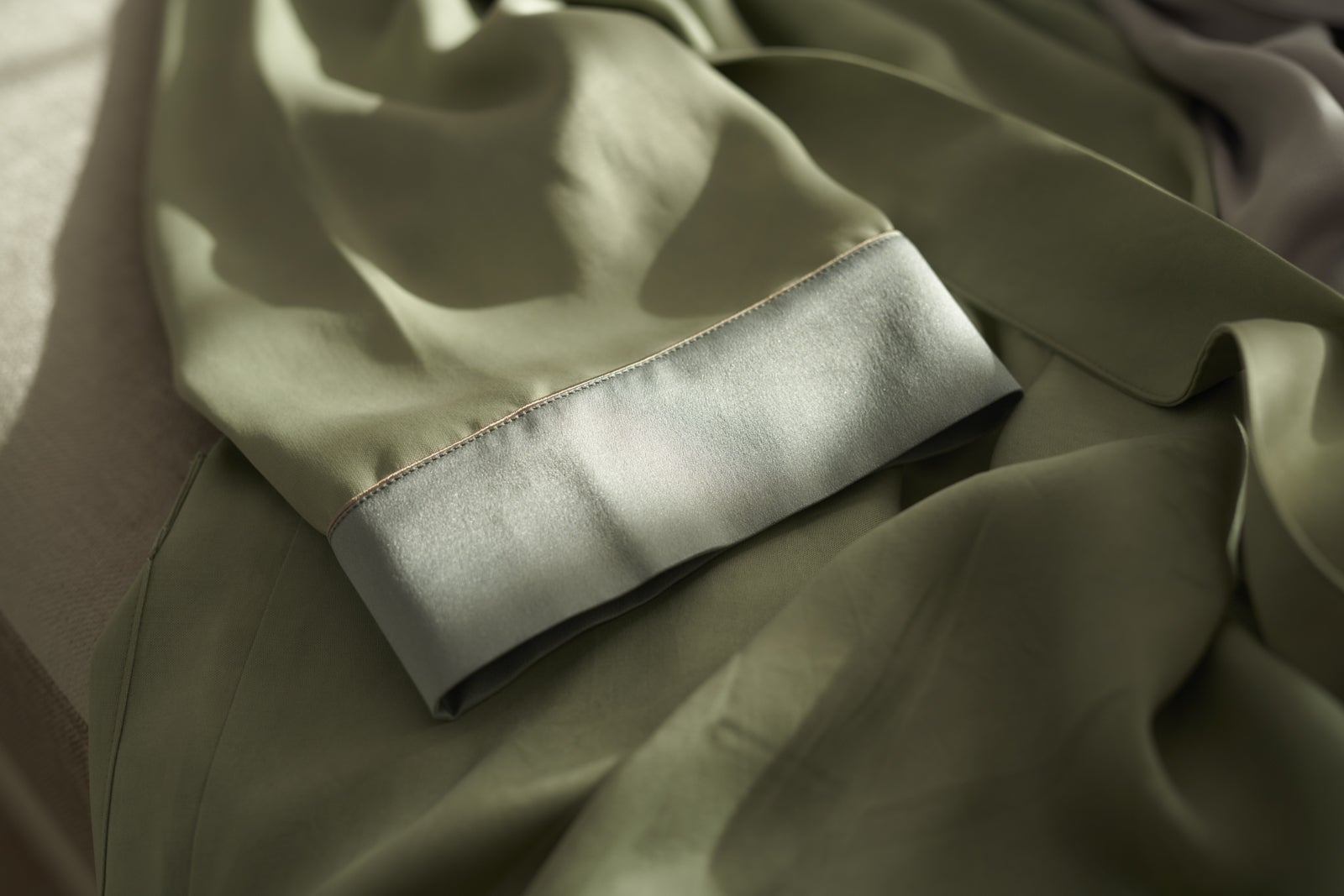 お部屋でのリラックスタイムや、近所のお散歩などちょっとした移動の際にご利用いただきたい、上品なガウン。襟元や袖口部分に施したコードパイピングが、より上品に仕立て上げています。京都と東京の職人さんが一枚一枚の生地を手作業で、草木染め・花びら染めの技術を使って染め上げています。より花を身近に感じるため、袖部分は国産シルクの上に花びら染めを施しています。花に包まれた気持ちになる極上のラグジュアリー時間をお楽しみください。