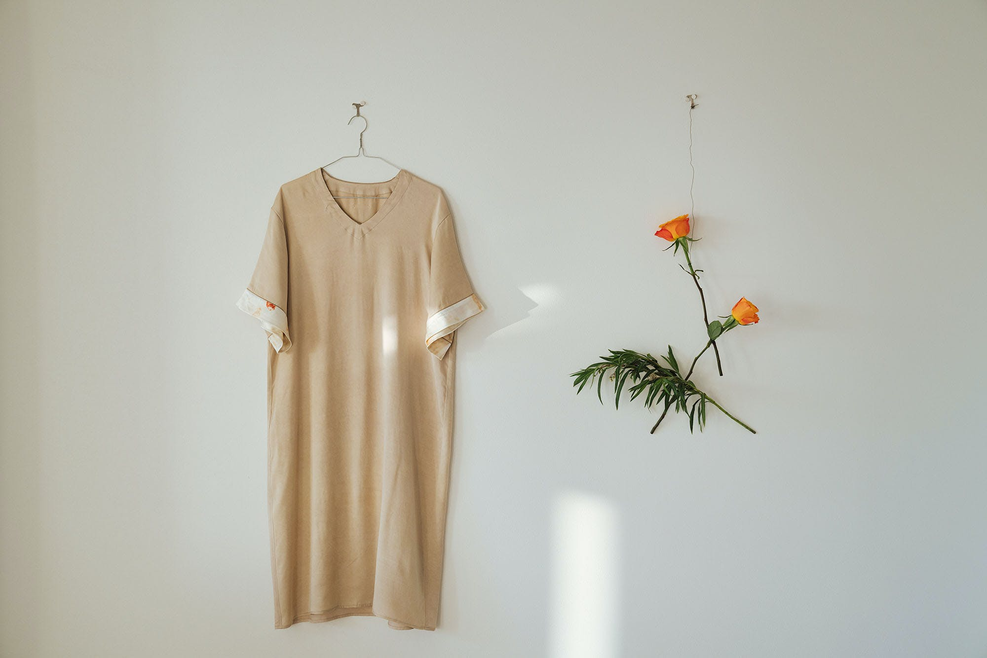お部屋でのリラックスタイムや、近所のお散歩などちょっとした移動の際に利用いただきたい、上品なワンピースパジャマ。袖口とスカートのフレア部分が女性らしく優しい印象になります。首元や袖口部分に施したコードパイピングが、より上品に仕立て上げています。京都と東京の職人さんが一枚一枚の生地を手作業で、草木染め・花びら染めの技術を使って染め上げています。より花を身近に感じるため、袖部分は国産シルクの上に花びら染めを施しております。花に包まれた気持ちになる極上のラグジュアリー時間をお楽しみください。
