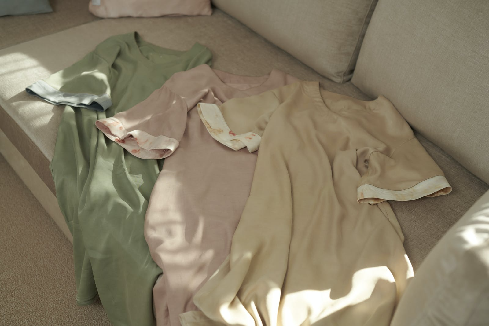 「mooneyo」が使用している生地は、植物の花びら、葉、枝、実などに含まれる自然の色を抽出して作った染料で染める「草木染め」と、花びらや葉を布の上に散りばめて縛り、蒸したり煮たりすることで花びら模様を作る「花びら染め」を行なっており、京都と東京で活動されている染織職人さんが一枚一枚手作業で染めています。化学染料とは違い、植物から抽出した色はさまざまな色、形、大きさの色素が含まれているため、光の当たり方によって色合いなどが異なって見えます。また、植物を採集する季節や育った環境によって染まる色が違います。一つひとつの色が、その時その植物だけが持っている特別な色なのです。