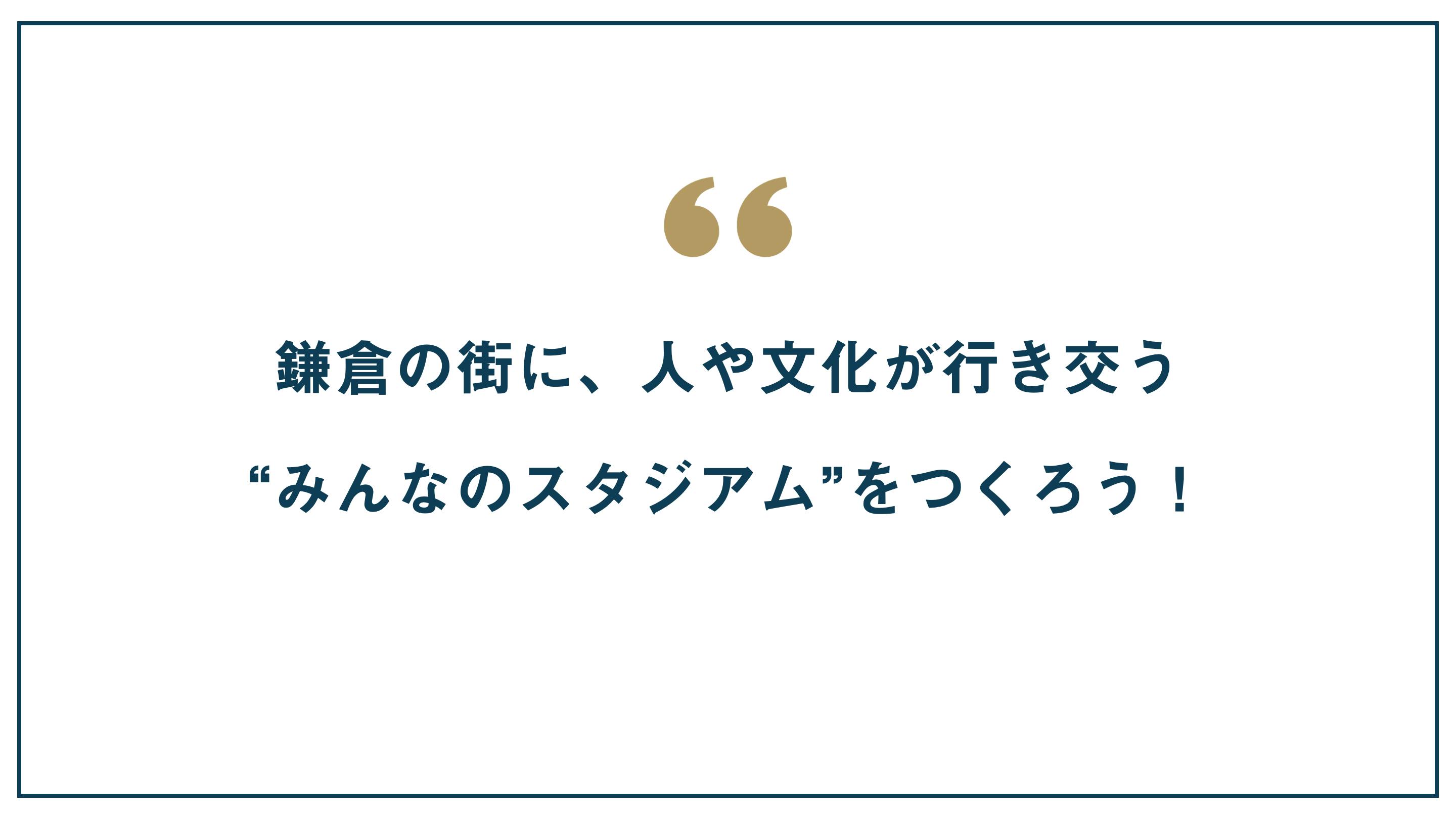将来、このプロジェクトで生まれた「場」が、地域の方々や鎌倉市外の方々はもとより、世界中から人々が行き交うハブとなり、新しい価値を創造する「鎌倉インターナショナルスタジアム」へと繋がることを、夢見ています。