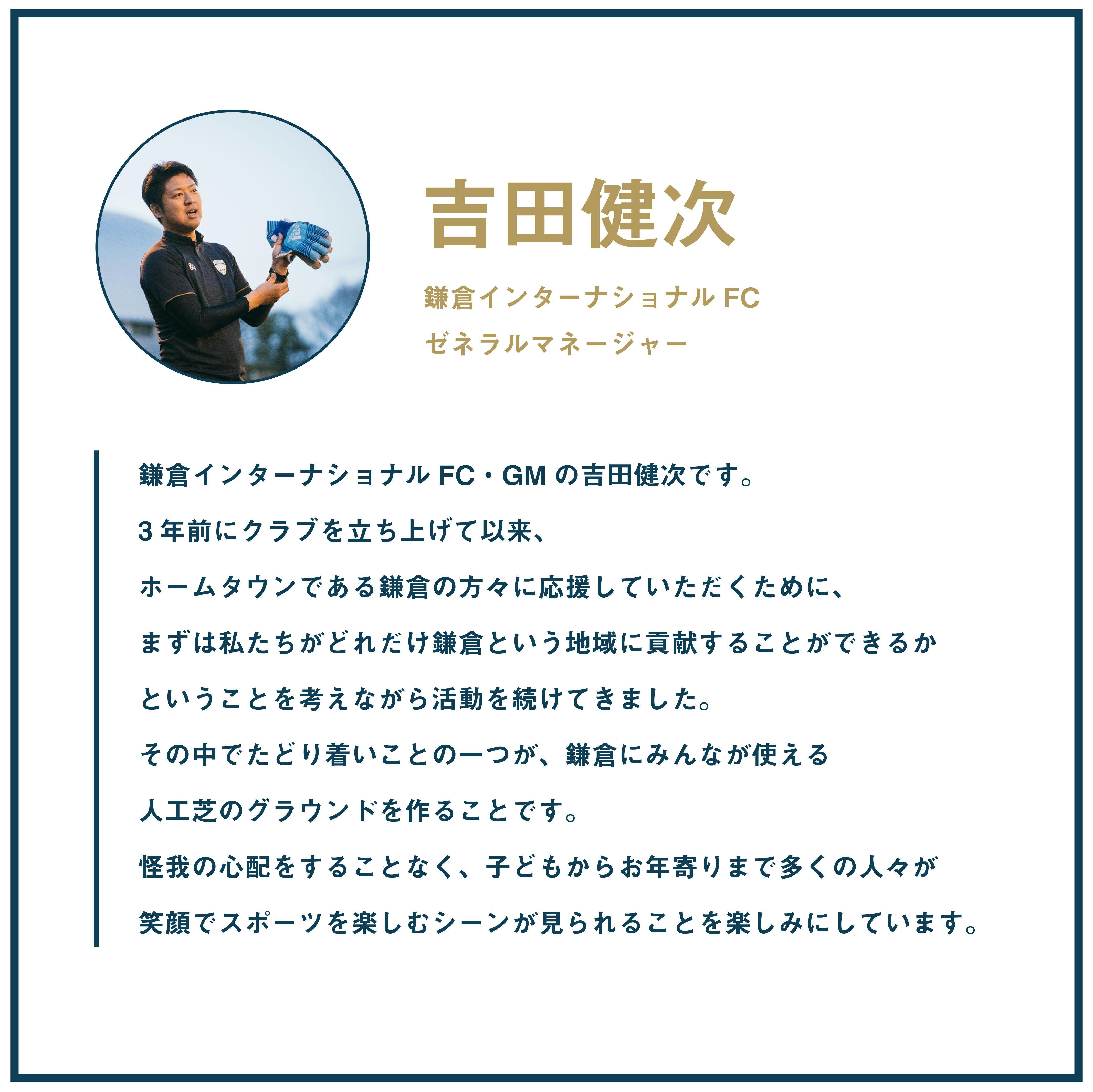 また、私たち鎌倉インターナショナルFCがプロサッカークラブになり、そして世界を目指すにあたって、充実したトレーニング環境を確保することは必要不可欠になります。良い活動環境のもと歩みを進め、プロのサッカークラブになることで、クラブとしてより大きな力をもって鎌倉や社会に影響を与え、チャレンジを続けていくこと自体が、鎌倉、ひいては日本のスポーツへの貢献になると信じています。