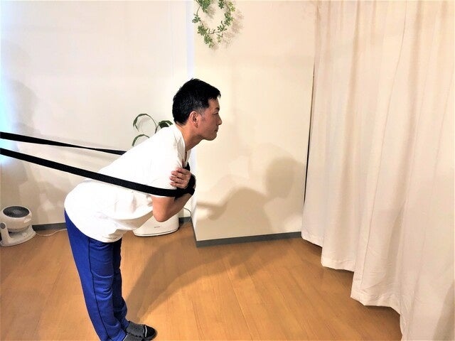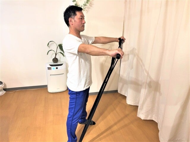 ドアにはさんで器具を固定します。そこにトレーニングバンドを結び付けトレーニングをおこないます。