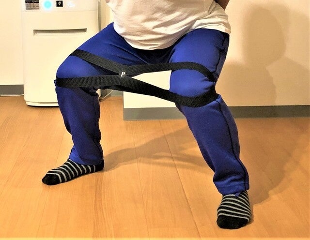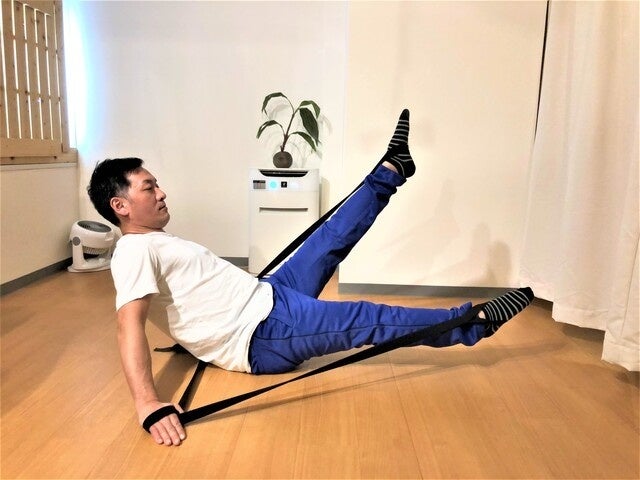 手と足に2本のトレーニングバンドをつけます。トレーニング効果も2倍です。