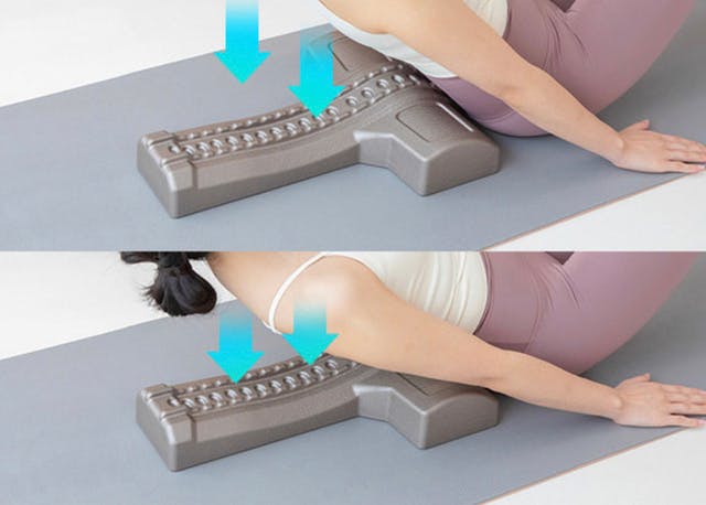 これが基本の位置ですが、少しずつ上にずらしたり、下にずらしたりして気持ちの良い所にそれぞれの突起を当てていきます。下は胸椎まで下げても大丈夫です。腰椎までいくとフィット感はなく痛いです。
