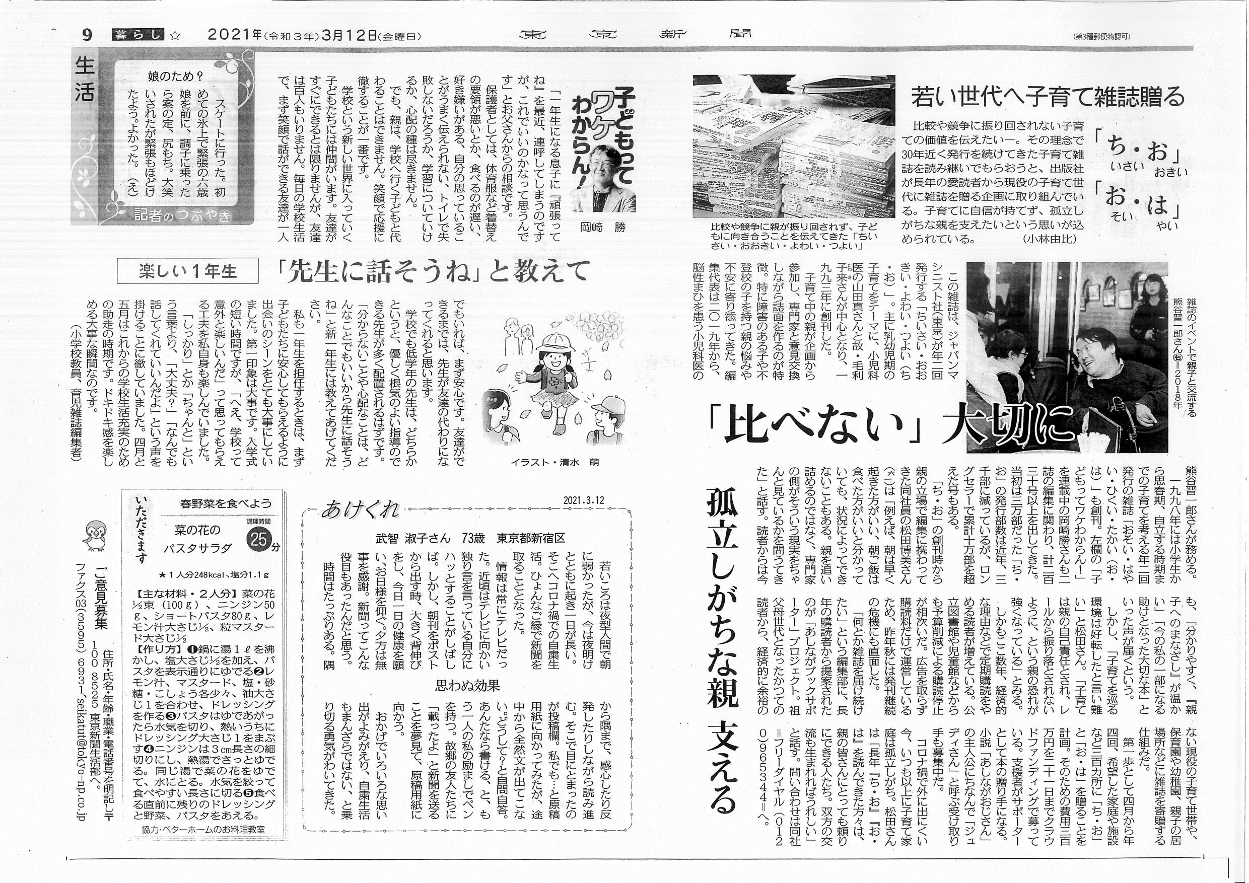 2021/03/12 10:54本日の朝刊に『ち・お』『お・は』の記事を掲載いただきました。東京・中日新聞の生活面です。紙面となりには、『お・は』編集人の岡崎勝さんの連載も掲載されています。ご支援が増えてきました。引き続き、どうぞよろしくお願いいたします!編集部松田 もっと見る明日12日の東京(中日)新聞にクラファンの記事がでます!