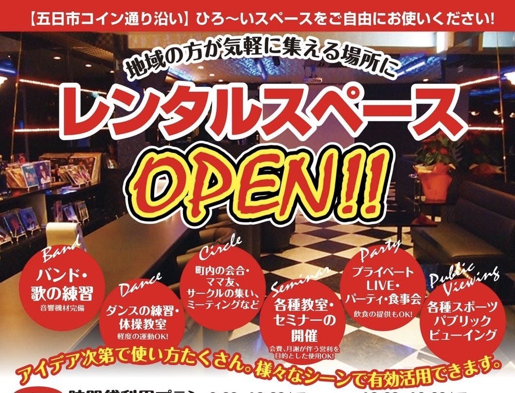 オールディーズ系の音楽と空間でお酒とカラオケが楽しめるお店。100㎡超の広々とした店内に音響設備や100インチスクリーンなどを設置し、定期的にプロのアーティストを招いて音楽イベントを開催、地元アマチュアバンドにもライブ会場として利用いただいています。